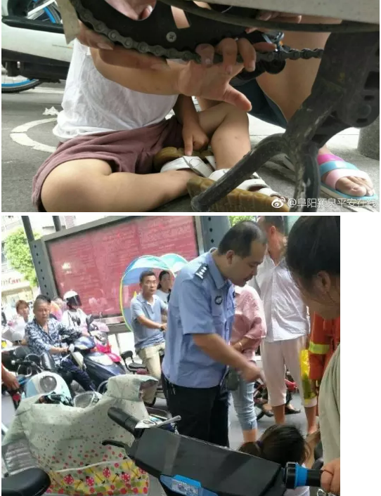 8月19日11时许,在阜城绿色步行街一商店门口附近,一名大约三四岁的儿童手指,被卡在共享自行车的链条里无法动弹,经颍州路派出所民警和消防官兵的联合救助,最终该儿童成功脱险。经颍州路派出所民警和消防官兵